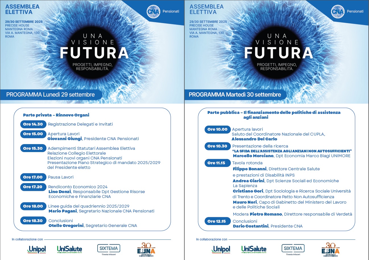CNA Pensionati – Il finanziamento delle politiche di assistenza agli anziani | 30/09/2025 Roma, Precise House Mantegna